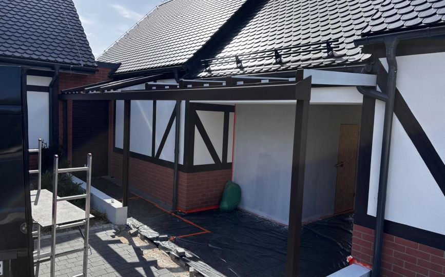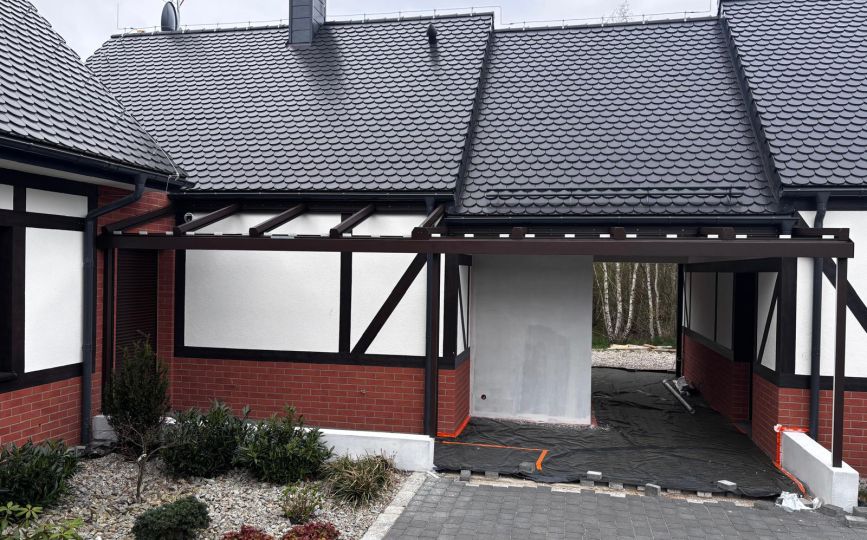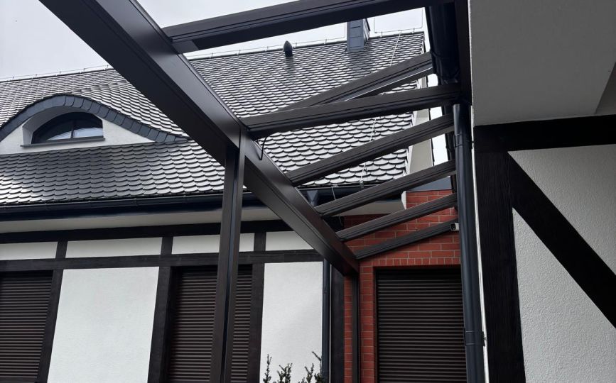 Bei dem hier vorgestellten Projekt handelt es sich um ein elegantes Vordach für den Durchgang zwischen den Gebäuden, das aus einer hochwertigen Aluminiumstruktur in einer Farbe besteht, die auf das Holzwerk des Gebäudes abgestimmt ist. Das Design fügt sich harmonisch in die klassische Architektur des Hauses ein, die Klinker, hellen Putz und dunkle Elemente, die Holzbalken imitieren, kombiniert.